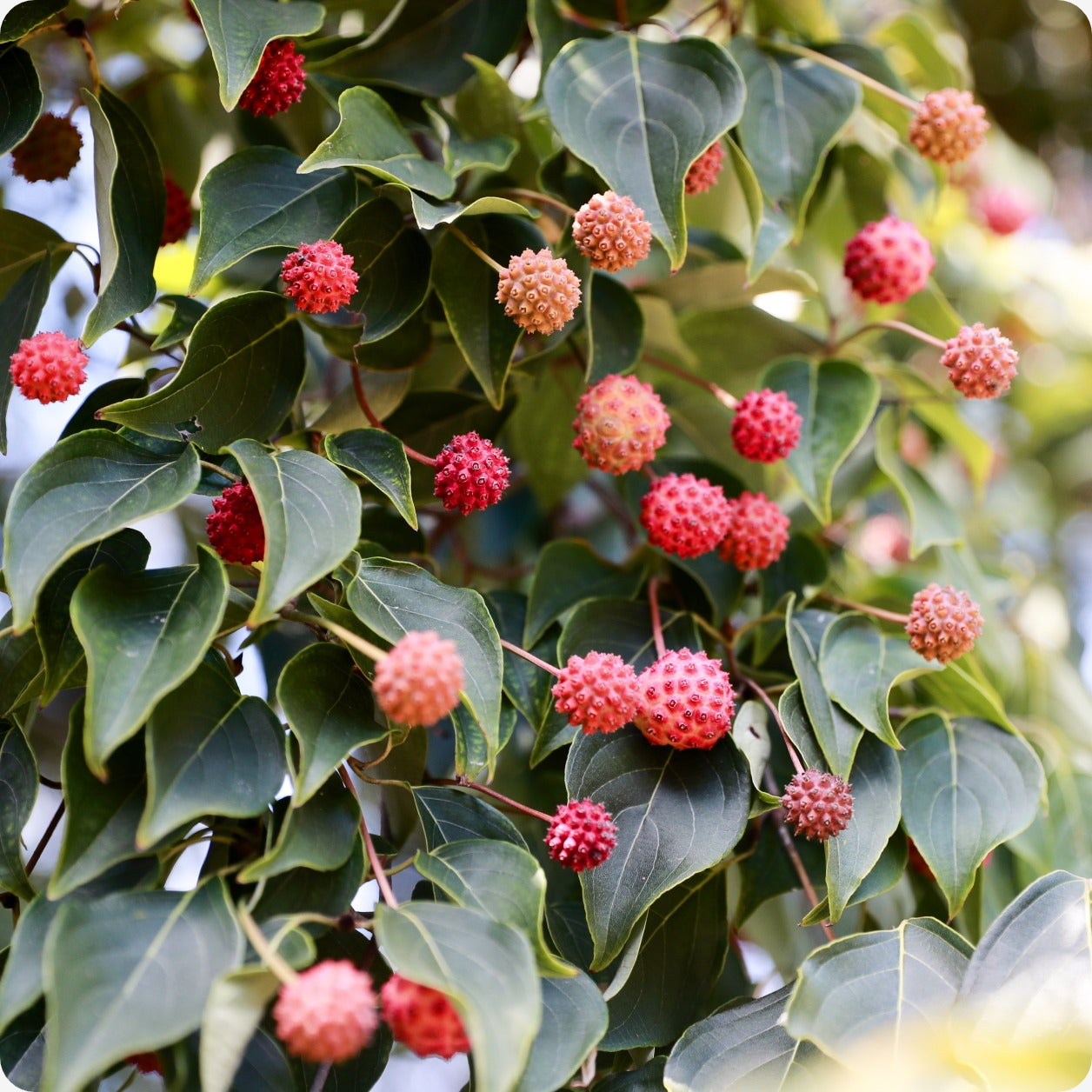 Also known as Himalayan Strawberry Tree, referencing its native range and lovely Fall fruit. Trees can grow 20-40 feet tall, with a bushy habit, growing just as wide. Lovely early-Summer blooms turn into showy strawberry-esque berries in the Fall, an excellent food source for neighbourhood birds, but also ornamentally attractive. Evergreen Dogwood's glossy green leaves also turn shades of purple and red in the Fall. Can tolerate clay soil well, but prefers well-draining, sandy soils best. Full sun to partial shade.