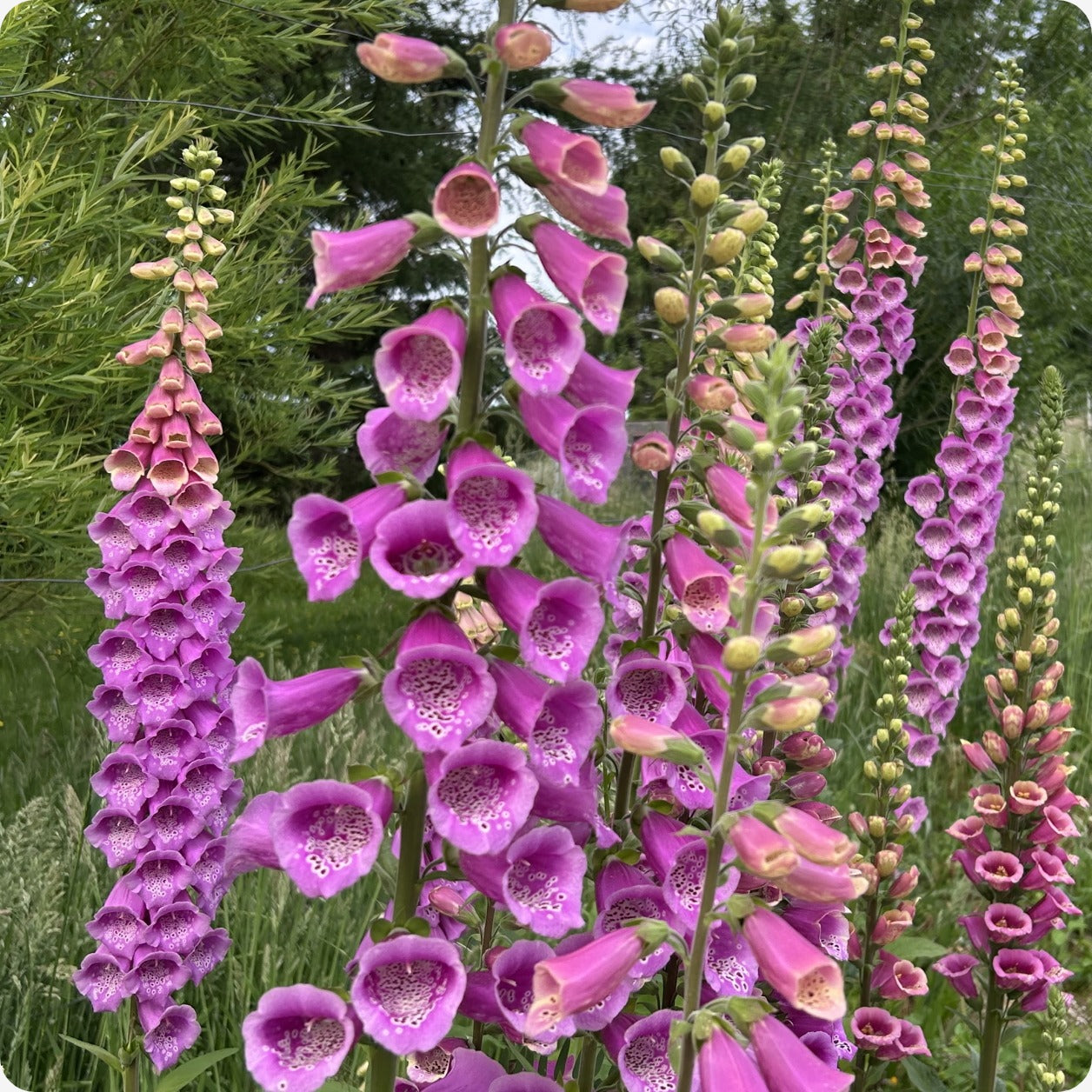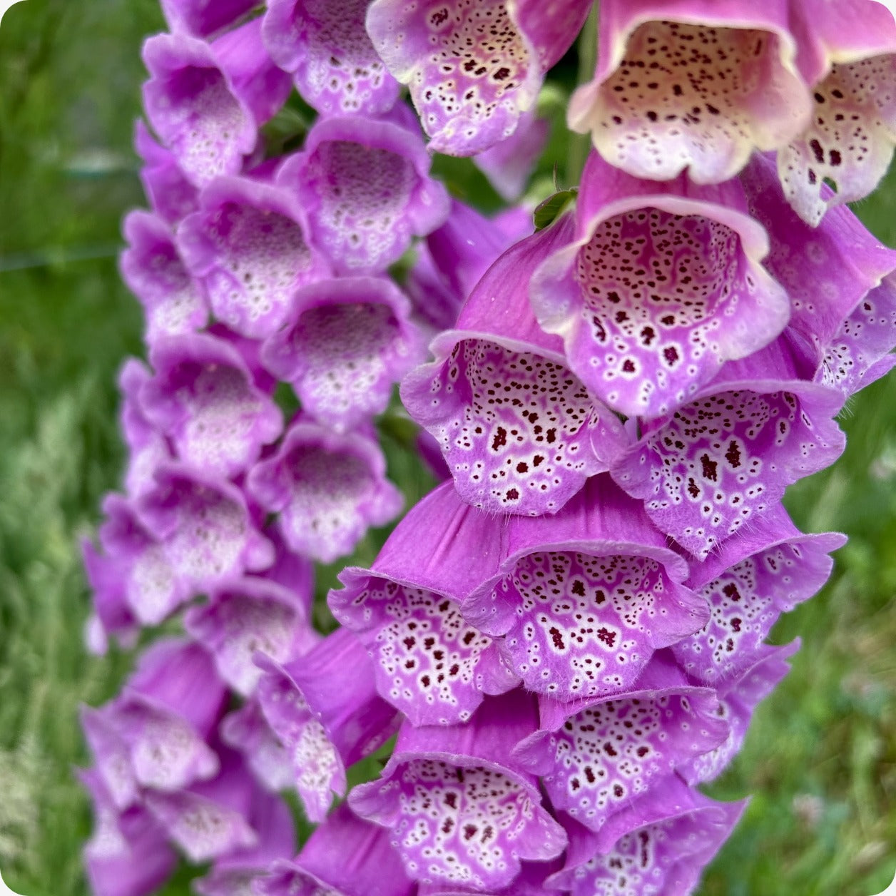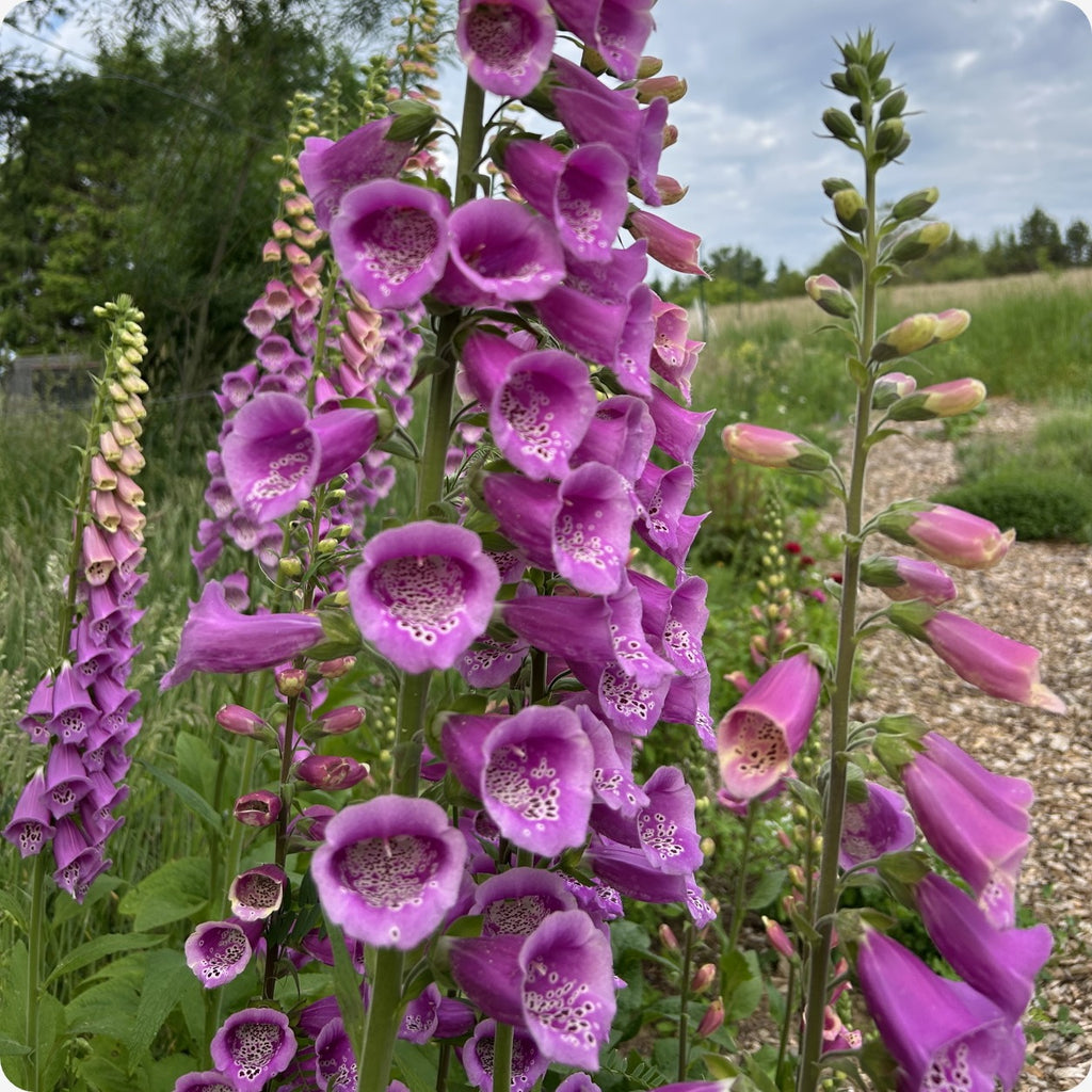 A biennial, Foxglove produces a light green rosette of leaves in its first year from seed. In its second year it sends up tall spikes with closely grouped, 2-3” long funnel-shaped dark rose-pink to purple flowers with purple and white spots inside. Its magnificent blooms appear in late Spring to mid Summer.