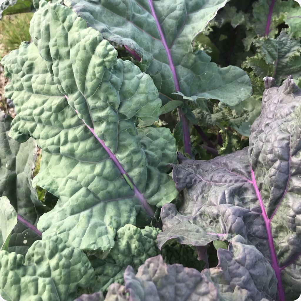 The green leaves are flat and textured with bright purple stems and slightly ruffled edges that turns a deep purple when winter sets in. The flavour of Rainbow Lacinato Kale is sweet and the texture robust without being rough. It is excellent sauteed or steamed and makes perfect kale chips.