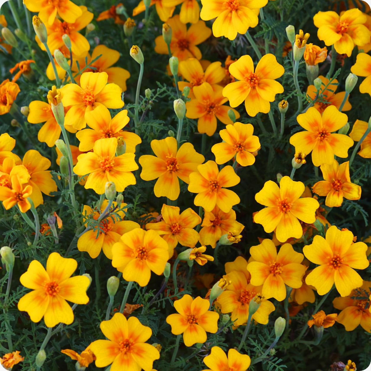 One of the more delicate marigolds, Tangerine gem produces many, small, simple orange flowers. Plant grows only to 12" and leaves are slender and frilly. When grown on the ground, Tangerine Gem marigold forms a tight hill of flowers. Also great for planters. All marigolds are edible! Tangerine Gem offers a sweet, citrus flavour.