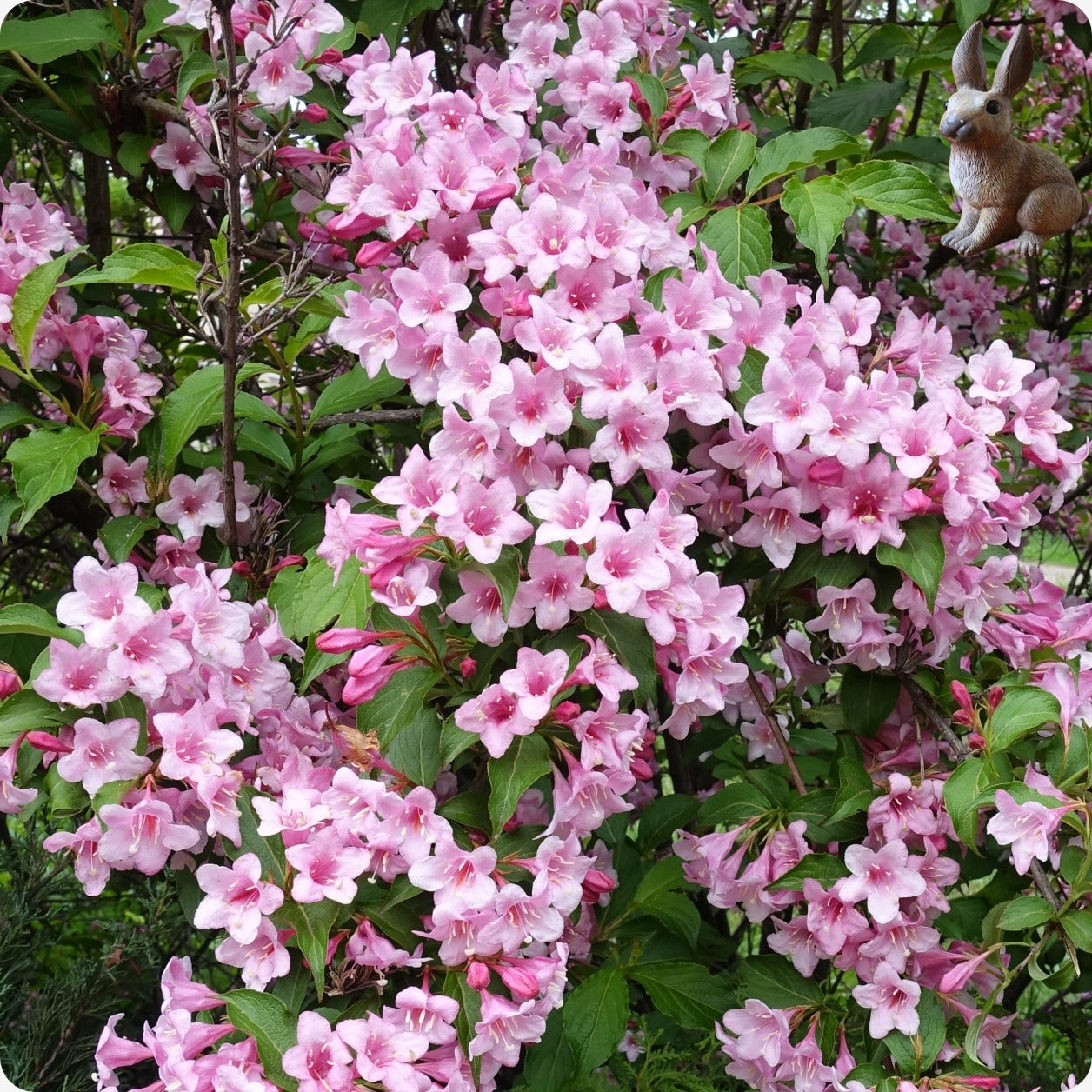 (Weigela florida) Perennial. Zones 5 - 8. Caprifoliaceae (Honeysuckle) Family. Native range—Eastern Asia. A beautiful flowering shrub, blooming in late-Spring. Full sun, tolerates partial shade. Flowers bloom on year old wood. Can grow up to 10 feet tall. One of our favorite floriferous plants!